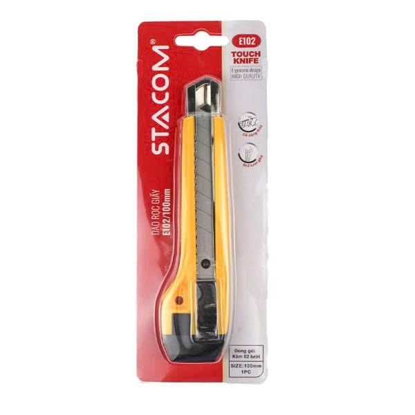 Dao đẩy lớn Stacom E102 là một công cụ tiện dụng để cắt, rọc giấy với lưỡi thép hợp kim sắc bén và thường đi kèm với 01 hoặc 02 lưỡi phụ tùy nhà bán lẻ.