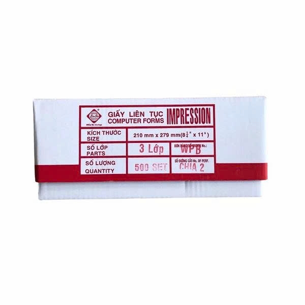 | Giấy Liên Sơn 3 liên chia | 3 | Chia 2 | Trắng – Hồng – Xanh dương | 1500 tờ/thùng | Máy in kim |