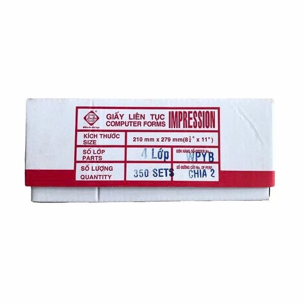 | Loại giấy | Số liên | Dạng chia | Màu liên phổ biến | Quy cách đóng gói | Sử dụng với máy in |