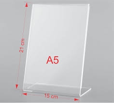| 21 × 30 cm | A4 | Dạng chữ L nghiêng, mica trong suốt 2mm, dùng cho thực đơn lớn, thông báo, poster |